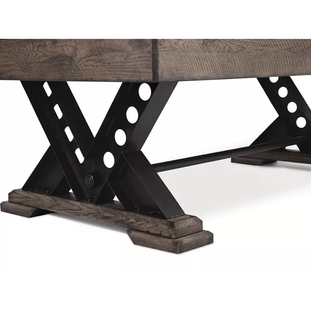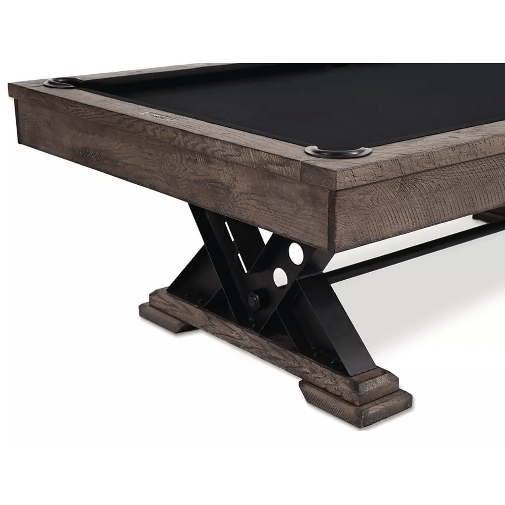 The Vienna Dining Pool Table features a stylish industrial metal pedestal leg with rustic rough cut wood rails . This solid wood pool table will be a focal point in any game room.